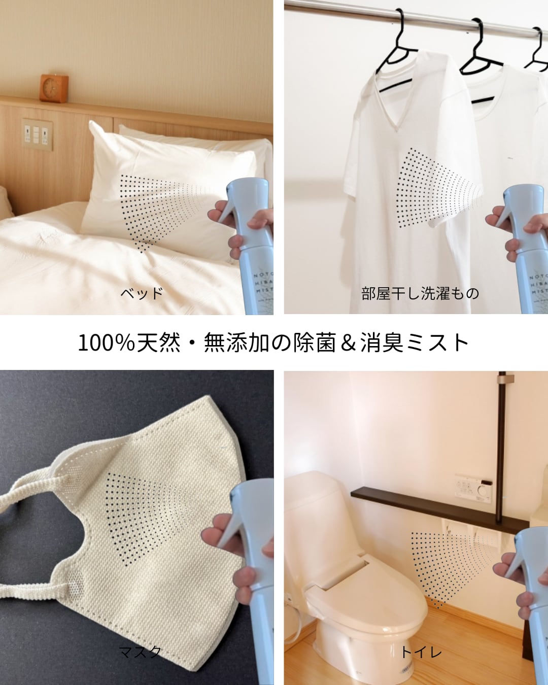 能登ヒバの豊かな香りに包まれながら、安心してご使用いただける除菌・消臭スプレーです。抗菌・消臭・防虫・癒し作用を兼ね備えた成分が、能登ヒバから抽出した100%天然成分になります。化学成分は一切不使用ですので、安心して使用できます。