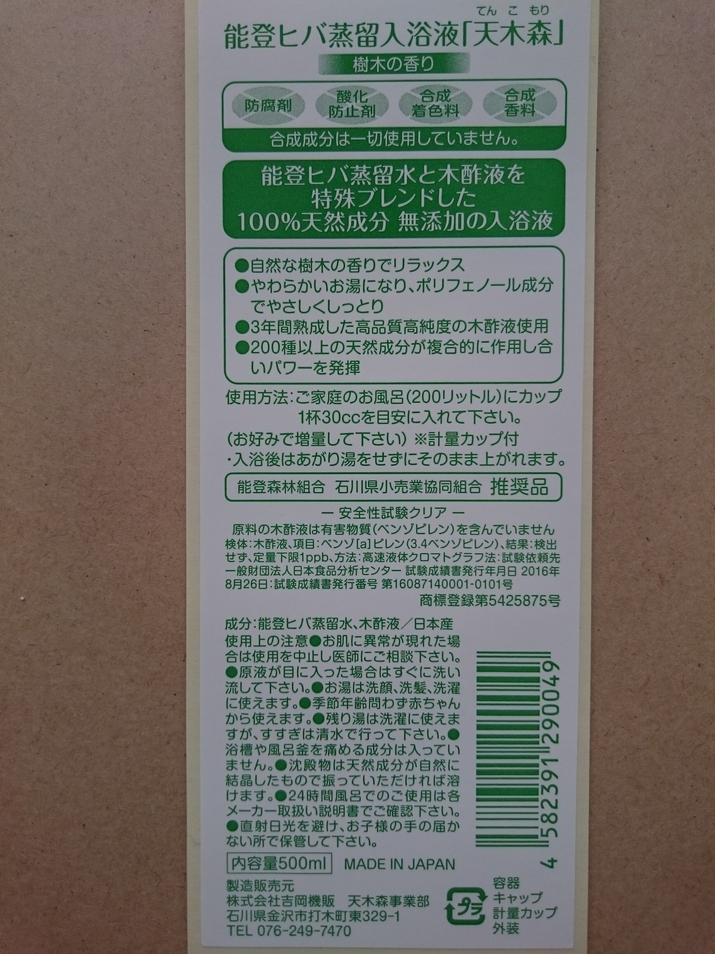 能登ヒバ蒸留入浴液「天木森」500ml 1本 (16回分)